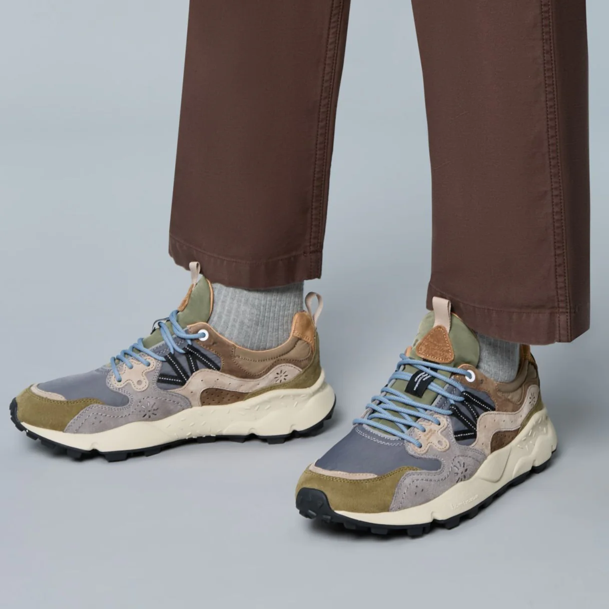 Tige : Suede et nylon Semelle extérieure : Gomme ultralight trail Semelle intérieure : Liege amovible Doublure : Cuir Couleur : Military-grey-brown Conseil chaussant : Prenez votre taille Particularité : Eco-responsable Ref interne : P02 Marque : Flower mountain Référence : 1f84
